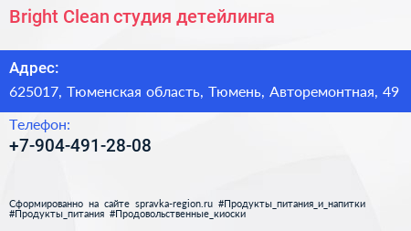 Bright Clean, студия детейлинга по адресу 625017, Тюменская область, Тюмень, Авторемонтная, 49 в дальнейшем Организация, размещена в следующих категориях:
