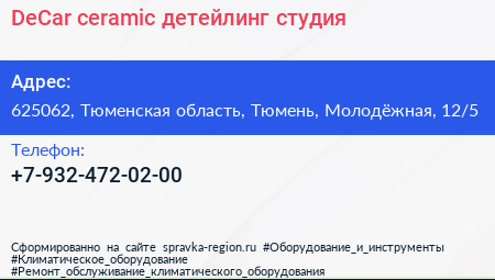 DeCar ceramic, детейлинг-студия по адресу 625062, Тюменская область, Тюмень, Молодёжная, 12/5 в дальнейшем Организация, размещена в следующих категориях: