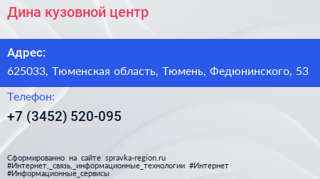 Дина, кузовной центр по адресу 625033, Тюменская область, Тюмень, Федюнинского, 53 в дальнейшем Организация, размещена в следующих категориях: