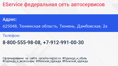EService, федеральная сеть автосервисов по адресу 625048, Тюменская область, Тюмень, Дамбовская, 2а в дальнейшем Организация, размещена в следующих категориях: