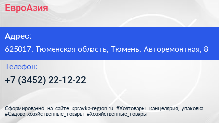ЕвроАзия по адресу 625017, Тюменская область, Тюмень, Авторемонтная, 8 в дальнейшем Организация, размещена в следующих категориях: