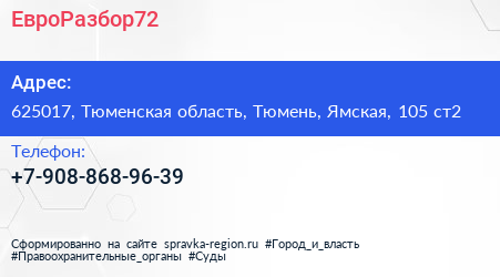 ЕвроРазбор72 по адресу 625017, Тюменская область, Тюмень, Ямская, 105 ст2 в дальнейшем Организация, размещена в следующих категориях: