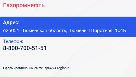Газпромнефть по адресу 625051, Тюменская область, Тюмень, Широтная, 104Б в дальнейшем Организация, размещена в следующих категориях: