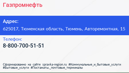 Газпромнефть по адресу 625017, Тюменская область, Тюмень, Авторемонтная, 15 в дальнейшем Организация, размещена в следующих категориях: