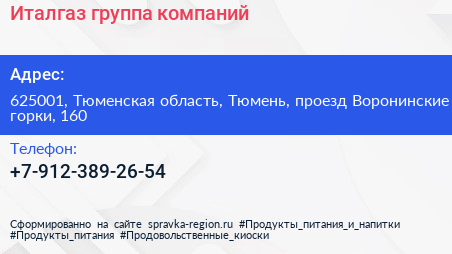 Италгаз, группа компаний по адресу 625001, Тюменская область, Тюмень, проезд Воронинские горки, 160 в дальнейшем Организация, размещена в следующих категориях: