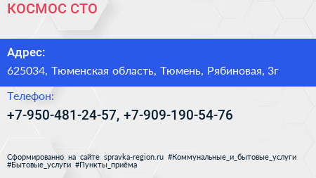 КОСМОС, СТО по адресу 625034, Тюменская область, Тюмень, Рябиновая, 3г в дальнейшем Организация, размещена в следующих категориях: