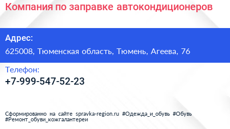 Компания по заправке автокондиционеров по адресу 625008, Тюменская область, Тюмень, Агеева, 76 в дальнейшем Организация, размещена в следующих категориях:
