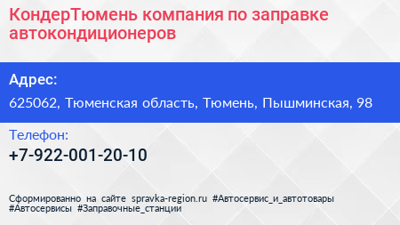 КондерТюмень, компания по заправке автокондиционеров по адресу 625062, Тюменская область, Тюмень, Пышминская, 98 в дальнейшем Организация, размещена в следующих категориях: