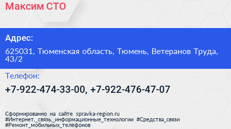 Максим, СТО по адресу 625031, Тюменская область, Тюмень, Ветеранов Труда, 43/2 в дальнейшем Организация, размещена в следующих категориях: