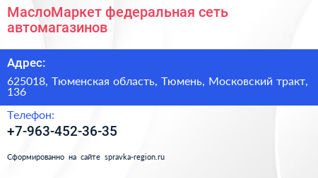 МаслоМаркет, федеральная сеть автомагазинов по адресу 625018, Тюменская область, Тюмень, Московский тракт, 136 в дальнейшем Организация, размещена в следующих категориях: