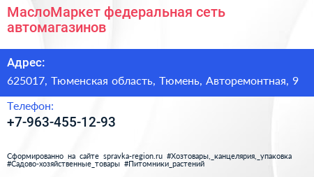 МаслоМаркет, федеральная сеть автомагазинов по адресу 625017, Тюменская область, Тюмень, Авторемонтная, 9 в дальнейшем Организация, размещена в следующих категориях: