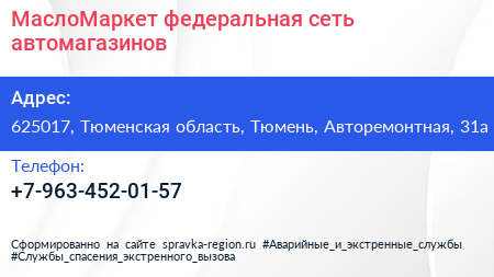 МаслоМаркет, федеральная сеть автомагазинов по адресу 625017, Тюменская область, Тюмень, Авторемонтная, 31а в дальнейшем Организация, размещена в следующих категориях: