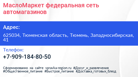 МаслоМаркет, федеральная сеть автомагазинов по адресу 625034, Тюменская область, Тюмень, Западносибирская, 41 в дальнейшем Организация, размещена в следующих категориях: