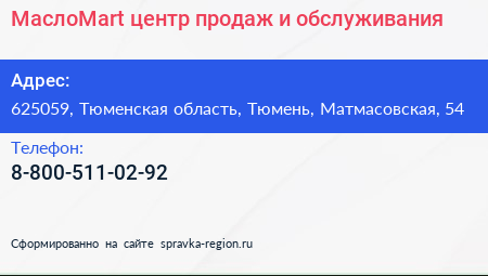 МаслоMart, центр продаж и обслуживания по адресу 625059, Тюменская область, Тюмень, Матмасовская, 54 в дальнейшем Организация, размещена в следующих категориях: