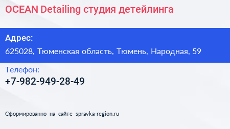 OCEAN Detailing, студия детейлинга по адресу 625028, Тюменская область, Тюмень, Народная, 59 в дальнейшем Организация, размещена в следующих категориях: