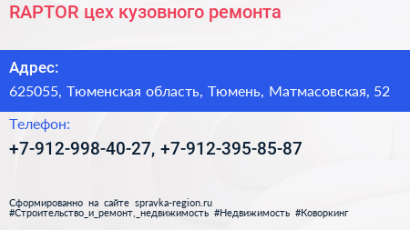 RAPTOR, цех кузовного ремонта по адресу 625055, Тюменская область, Тюмень, Матмасовская, 52 в дальнейшем Организация, размещена в следующих категориях: