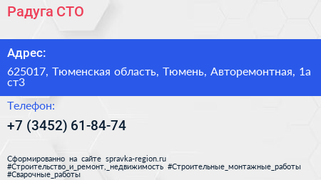 Радуга, СТО по адресу 625017, Тюменская область, Тюмень, Авторемонтная, 1а ст3 в дальнейшем Организация, размещена в следующих категориях: