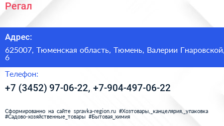 Регал по адресу 625007, Тюменская область, Тюмень, Валерии Гнаровской, 6 в дальнейшем Организация, размещена в следующих категориях: