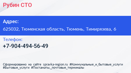 Рубин, СТО по адресу 625032, Тюменская область, Тюмень, Тимирязева, 6 в дальнейшем Организация, размещена в следующих категориях: