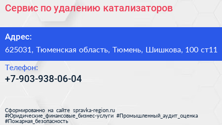 Сервис по удалению катализаторов по адресу 625031, Тюменская область, Тюмень, Шишкова, 100 ст11 в дальнейшем Организация, размещена в следующих категориях: