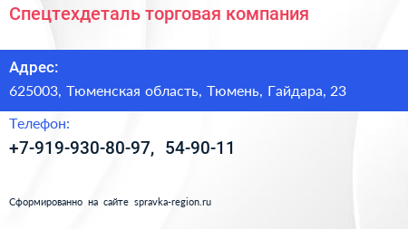 Спецтехдеталь, торговая компания по адресу 625003, Тюменская область, Тюмень, Гайдара, 23 в дальнейшем Организация, размещена в следующих категориях: