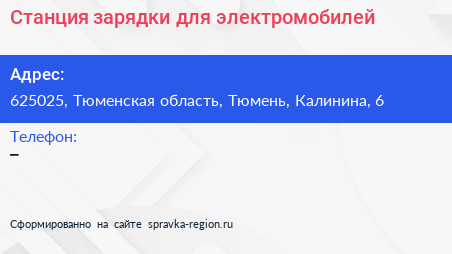 Станция зарядки для электромобилей по адресу 625025, Тюменская область, Тюмень, Калинина, 6 в дальнейшем Организация, размещена в следующих категориях: