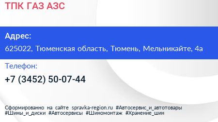 ТПК ГАЗ, АЗС по адресу 625022, Тюменская область, Тюмень, Мельникайте, 4а в дальнейшем Организация, размещена в следующих категориях: