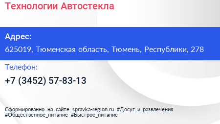 Технологии Автостекла по адресу 625019, Тюменская область, Тюмень, Республики, 278 в дальнейшем Организация, размещена в следующих категориях: