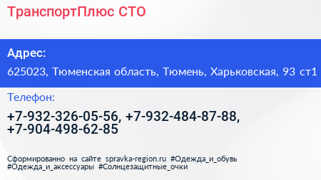 ТранспортПлюс, СТО по адресу 625023, Тюменская область, Тюмень, Харьковская, 93 ст1 в дальнейшем Организация, размещена в следующих категориях: