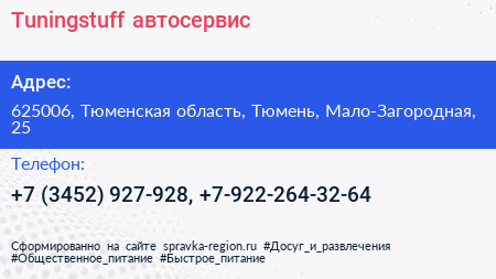 Tuningstuff, автосервис по адресу 625006, Тюменская область, Тюмень, Мало-Загородная, 25 в дальнейшем Организация, размещена в следующих категориях: