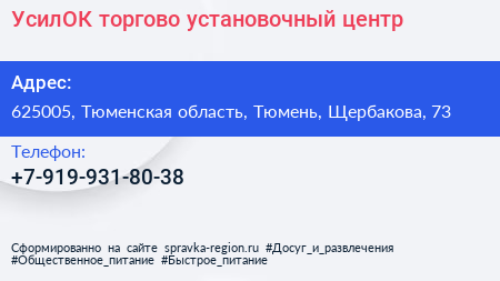 УсилОК, торгово-установочный центр по адресу 625005, Тюменская область, Тюмень, Щербакова, 73 в дальнейшем Организация, размещена в следующих категориях:
