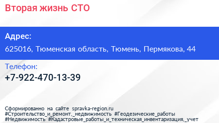 Вторая жизнь, СТО по адресу 625016, Тюменская область, Тюмень, Пермякова, 44 в дальнейшем Организация, размещена в следующих категориях: