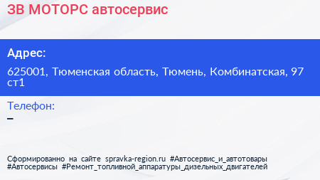 ЗВ МОТОРС, автосервис по адресу 625001, Тюменская область, Тюмень, Комбинатская, 97 ст1 в дальнейшем Организация, размещена в следующих категориях: