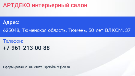 АРТДЕКО, интерьерный салон по адресу 625048, Тюменская область, Тюмень, 50 лет ВЛКСМ, 37 в дальнейшем Организация, размещена в следующих категориях: