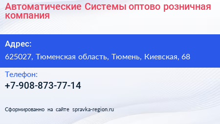 Автоматические Системы, оптово-розничная компания по адресу 625027, Тюменская область, Тюмень, Киевская, 68 в дальнейшем Организация, размещена в следующих категориях: