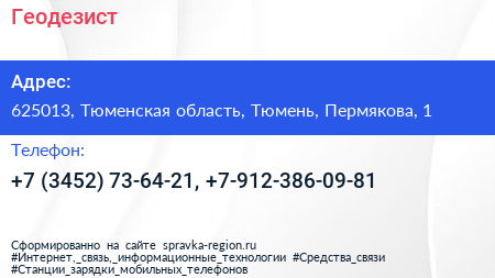 Геодезист по адресу 625013, Тюменская область, Тюмень, Пермякова, 1 в дальнейшем Организация, размещена в следующих категориях: