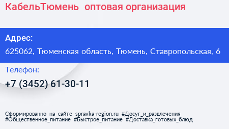 КабельТюмень+, оптовая организация по адресу 625062, Тюменская область, Тюмень, Ставропольская, 6 в дальнейшем Организация, размещена в следующих категориях: