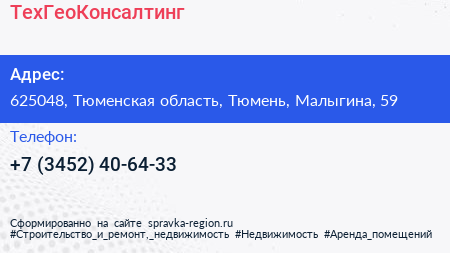 ТехГеоКонсалтинг по адресу 625048, Тюменская область, Тюмень, Малыгина, 59 в дальнейшем Организация, размещена в следующих категориях: