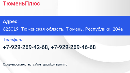 ТюменьПлюс по адресу 625019, Тюменская область, Тюмень, Республики, 204а в дальнейшем Организация, размещена в следующих категориях: