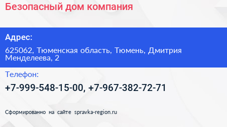 Безопасный дом, компания по адресу 625062, Тюменская область, Тюмень, Дмитрия Менделеева, 2 в дальнейшем Организация, размещена в следующих категориях: