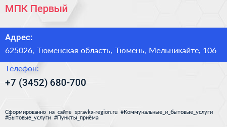 МПК Первый по адресу 625026, Тюменская область, Тюмень, Мельникайте, 106 в дальнейшем Организация, размещена в следующих категориях: