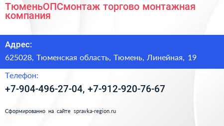 ТюменьОПСмонтаж, торгово-монтажная компания по адресу 625028, Тюменская область, Тюмень, Линейная, 19 в дальнейшем Организация, размещена в следующих категориях: