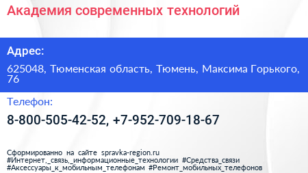 Академия современных технологий по адресу 625048, Тюменская область, Тюмень, Максима Горького, 76 в дальнейшем Организация, размещена в следующих категориях: