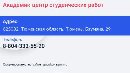 Академик, центр студенческих работ по адресу 625032, Тюменская область, Тюмень, Баумана, 29 в дальнейшем Организация, размещена в следующих категориях: