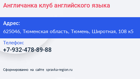 Англичанка, клуб английского языка по адресу 625046, Тюменская область, Тюмень, Широтная, 108 к5 в дальнейшем Организация, размещена в следующих категориях: