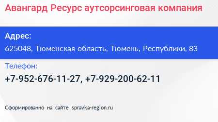 Авангард Ресурс, аутсорсинговая компания по адресу 625048, Тюменская область, Тюмень, Республики, 83 в дальнейшем Организация, размещена в следующих категориях: