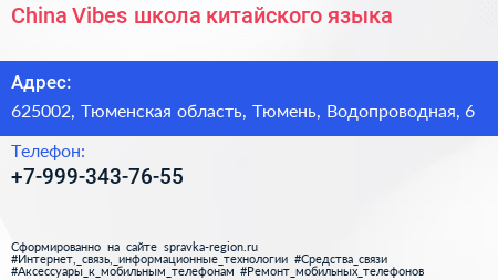 China Vibes, школа китайского языка по адресу 625002, Тюменская область, Тюмень, Водопроводная, 6 в дальнейшем Организация, размещена в следующих категориях: