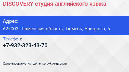 DISCOVERY, студия английского языка по адресу 625003, Тюменская область, Тюмень, Урицкого, 5 в дальнейшем Организация, размещена в следующих категориях: