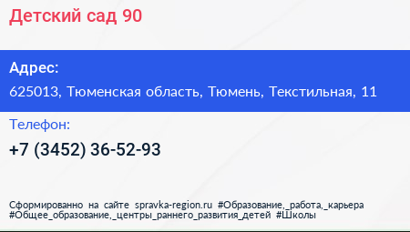 Детский сад №90 по адресу 625013, Тюменская область, Тюмень, Текстильная, 11 в дальнейшем Организация, размещена в следующих категориях: