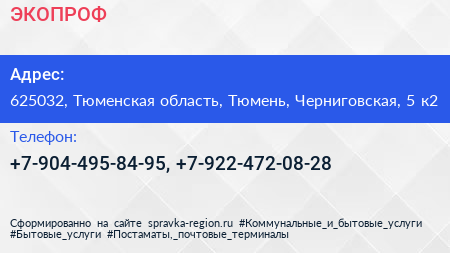 ЭКОПРОФ по адресу 625032, Тюменская область, Тюмень, Черниговская, 5 к2 в дальнейшем Организация, размещена в следующих категориях: